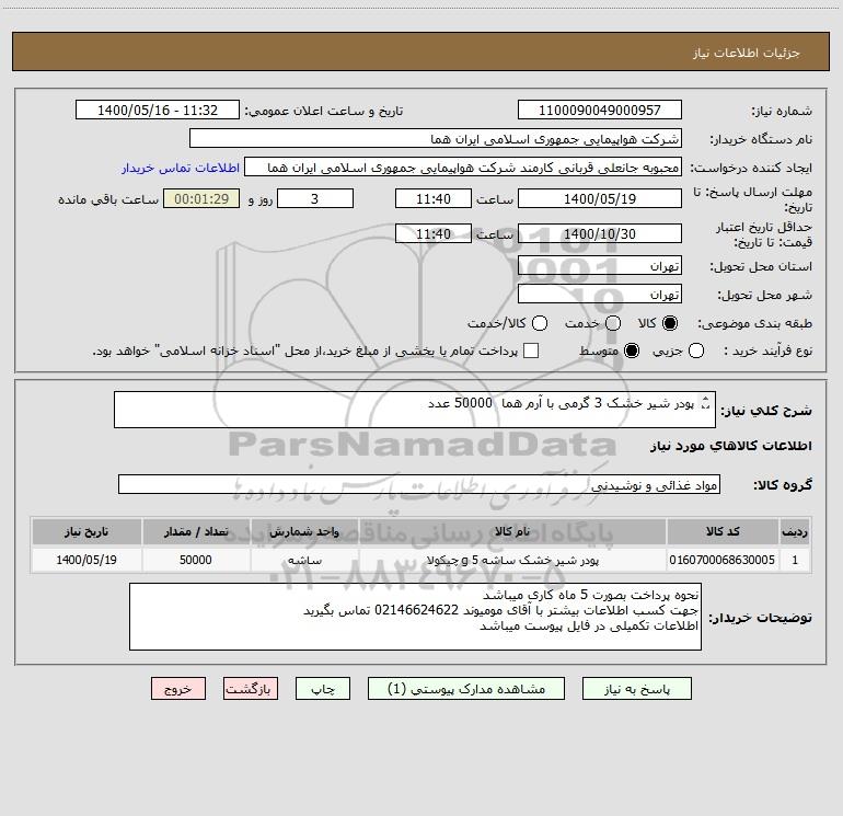 شرح کلی نیاز: پودر شیر خشک 3 گرمی با آرم هما 50000 عدد