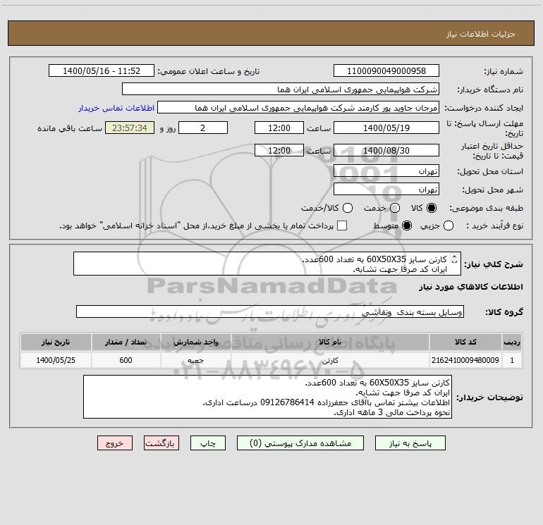 شرح کلی نیاز: کارتن سایز 60X50X35 به تعداد 600عدد. ایران کد صرفا جهت تشابه. اطلاعات بیشتر توضیحات مطالعه شود.