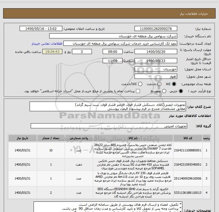 شرح کلی نیاز: تجهیزات ایمنی(کلاه، دستکش فشار قوی، فازمتر فشار قوی، ست سیم گراند)