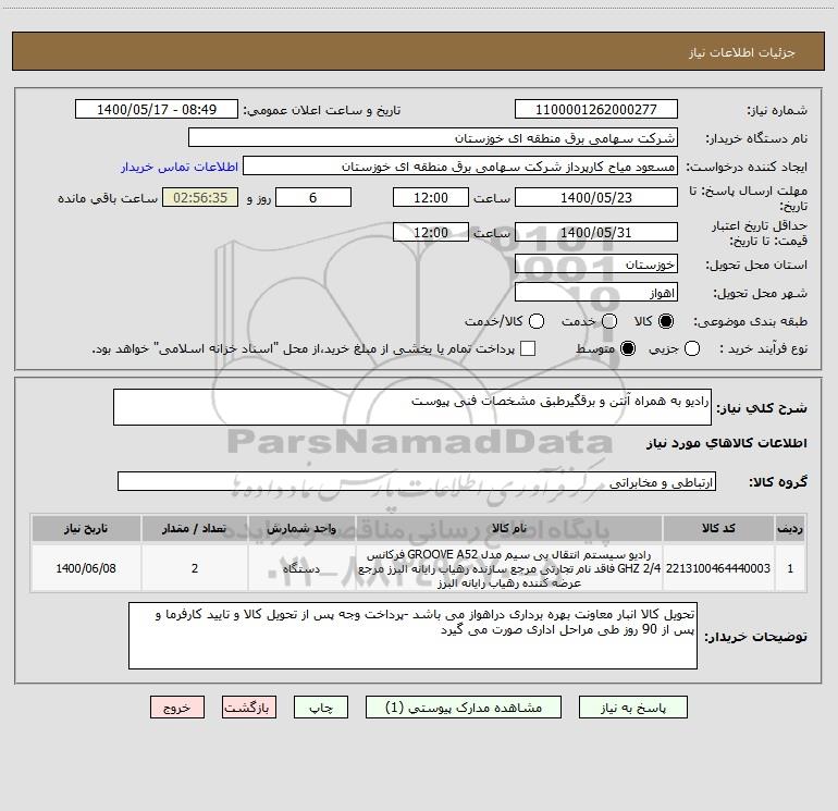 شرح کلی نیاز: رادیو به همراه آنتن و برقگیرطبق مشخصات فنی پیوست