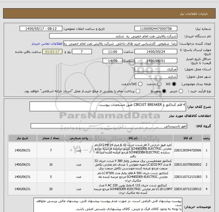 شرح کلی نیاز: 4 قلم کنتاکتور و CIRCUIT BREAKER طبق مشخصات پیوست.