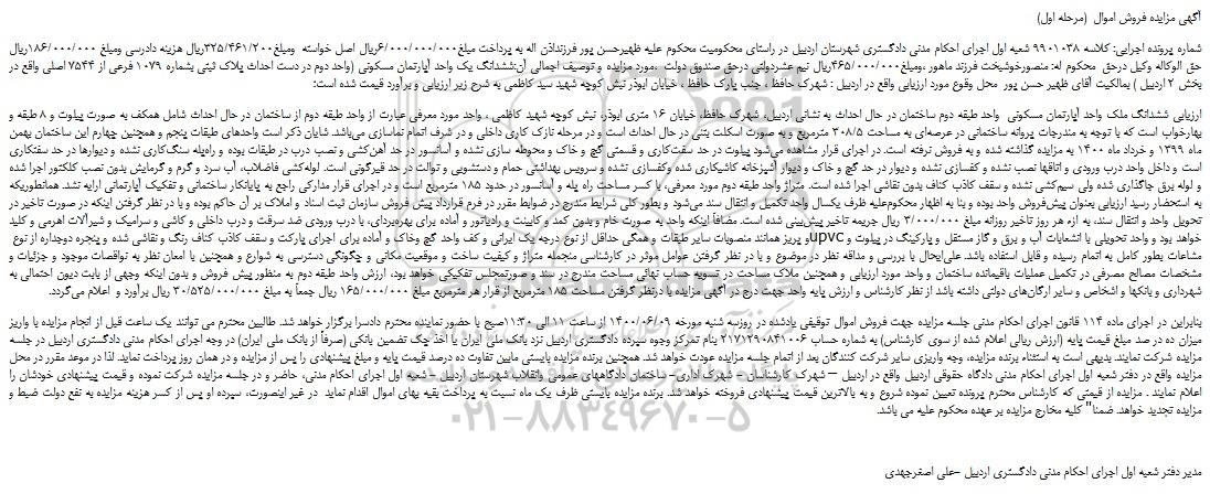 شماره پرونده اجرایی: کلاسه 9901038 شعبه اول اجرای احکام مدنی دادگستری شهرستان اردبیل در راستای محکومیت محکوم علیه ظهیرحسن پور فرزنداذن اله به پرداخت مبلغ6/000/000/000ریال اصل خواسته  ومبلغ325/461/200ریال هزینه دادرسی ومبلغ 186/000/000ریال حق الوکاله وکیل درحق  محکوم له: منصورخوشبخت فرزند ماهور ،ومبلغ465/000/000ریال نیم عشردولتی درحق صندوق دولت  ،مورد مزایده و توصیف اجمالی آن:ششدانگ یک واحد آپارتمان مسکونی (واحد دوم در دست احداث پلاک ثبتی بشماره 1079 فرعی از 7544 اصلی واقع در بخش 2 اردبیل ) بمالکیت آقای ظهیر حسن پور  محل وقوع مورد ارزیابی واقع در اردبیل : شهرک حافظ ، جنب پارک حافظ ، خیابان ابوذر نبش کوچه شهید سید کاظمی به شرح زیر ارزیابی و برآورد قیمت شده است؛