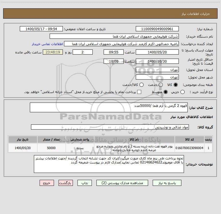 شرح کلی نیاز: قهوه 2 گرمی با آرم هما /50000عدد
