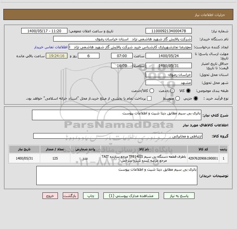 نام دستگاه خریدار:شرکت پالایش گاز شهید هاشمی نژاد استان خراسان رضوی