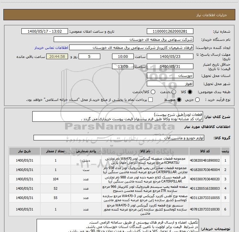 شرح کلی نیاز: قطعات لودر(طبق شرح پیوست)