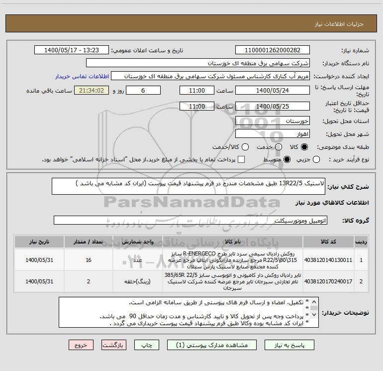 شرح کلی نیاز: لاستیک 13R22/5 طبق مشخصات مندرج در فرم پیشنهاد قیمت پیوست (ایران کد مشابه می باشد )