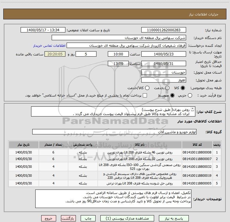 شرح کلی نیاز: روغن بهران( طبق شرح پیوست) ایران کد مشابه بوده وکالا طبق فرم پیشنهاد قیمت پیوست خریداری می گردد .