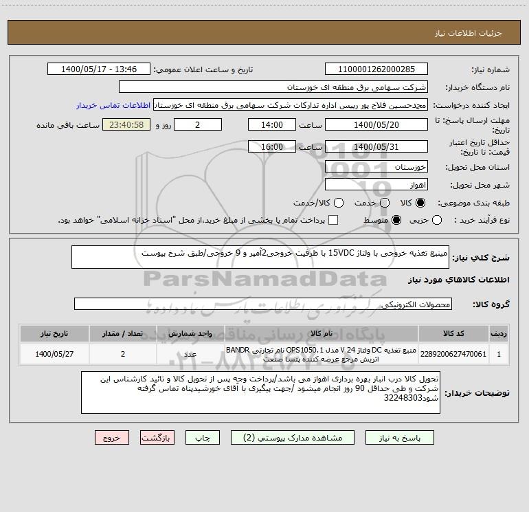 نام دستگاه خریدار:شرکت سهامی برق منطقه ای خوزستان
