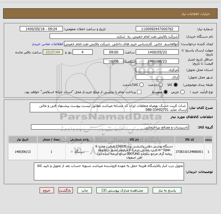 شرح کلی نیاز: شات کریت خشک بهمراه متعلقات ایران کد مشابه میباشد مطابق لیست پیوست پیشنهاد فنی و مالی ارسال نماید 33492701-086