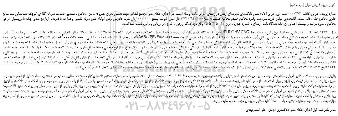 شماره پرونده اجرایی: کلاسه 0000374 شعبه اول اجرای احکام مدنی دادگستری شهرستان اردبیل در راستای اجرای نیابت واصله ازشعبه دو اجرای احکام مدنی مجتمع قضایی شهید بهشتی تهران مطروحه مابین، محکوم له:صندوق ضمانت سرمایه گذاری کوچک بانمایندگی سید صالح علوی محکوم علیه :خانم سعیده آقامحمدی تولون فرزند میرمحمد وغیره محکوم علیهم محکوم هستند به مبلغ2/211/940/000ریال اصل خواسته ومبلغ1/000/000ریال هزینه دادرسی وحق الوکاله طبق تعرفه قانونی وخسارت تاخیرتادیه ازتاریخ صدور چک تاروزوصول درحق محکوم له،مورد مزایده و توصیف اجمالی آن: یک دستگاه وانت آریسان به شماره خودرو : ایران 91- 645 ط 35 واقع درپارکینگ زارعی به شرح زیر ارزیابی و برآورد قیمت شده است؛