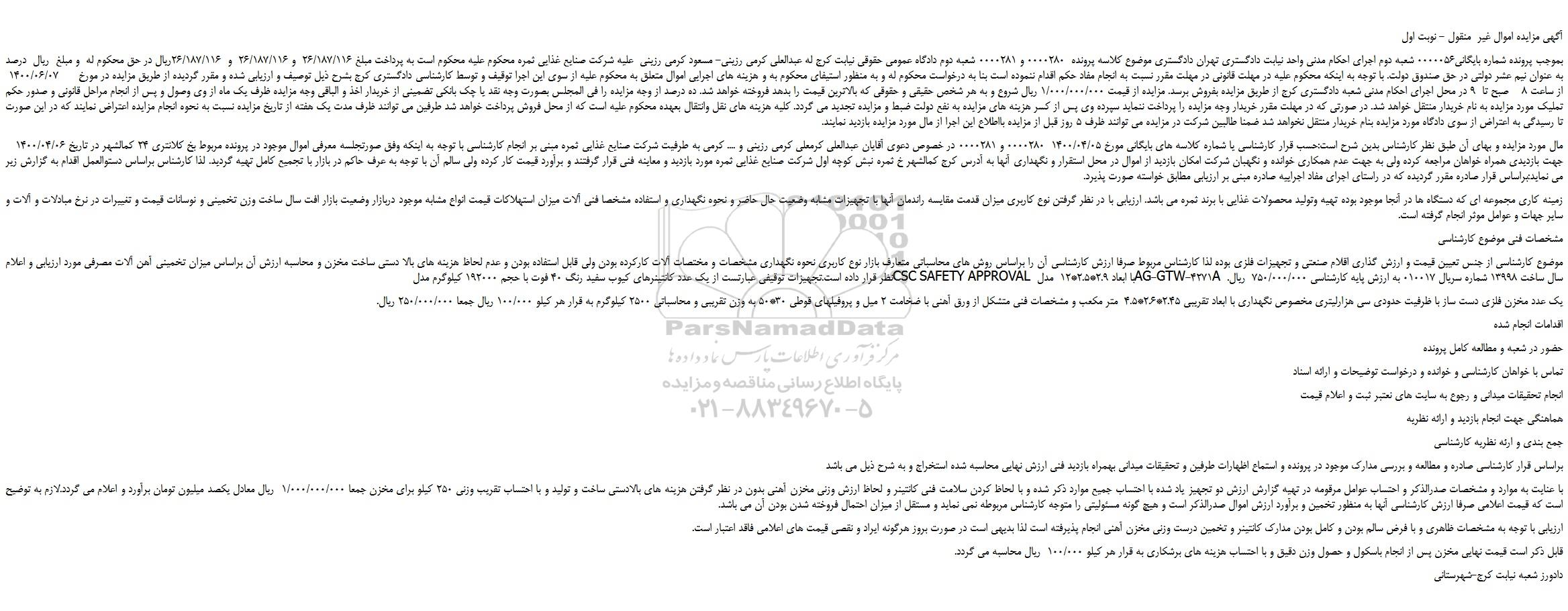 مال مورد مزایده و بهای آن طبق نظر کارشناس بدین شرح است:حسب قرار کارشناسی یا شماره کلاسه های بایگانی مورخ 1400/04/05 0000280 و 0000281 در خصوص دعوی آقایان عبدالعلی کرمعلی کرمی رزینی و .... کرمی به طرفیت شرکت صنایع غذایی ثمره مبنی بر انجام کارشناسی با توجه به اینکه وفق صورتجلسه معرفی اموال موجود در پرونده مربوط بخ کلانتری 24 کمالشهر در تاریخ 1400/04/06 جهت بازدیدی همراه خواهان مراجعه کرده ولی به جهت عدم همکاری خوانده و نگهبان شرکت امکان بازدید از اموال در محل استقرار و نگهداری آنها به آدرس کرج کمالشهر خ ثمره نبش کوچه اول شرکت صنایع غذایی ثمره مورد بازدید و معاینه فنی قرار گرفتند و برآورد قیمت کار کرده ولی سالم آن با توجه به عرف حاکم در بازار با تجمیع کامل تهیه گردید. لذا کارشناس براساس دستوالعمل اقدام به گزارش زیر می نماید:براساس قرار صادره مقرر گردیده که در راستای اجرای مفاد اجراییه صادره مبنی بر ارزیابی مطابق خواسته صورت پذیرد.