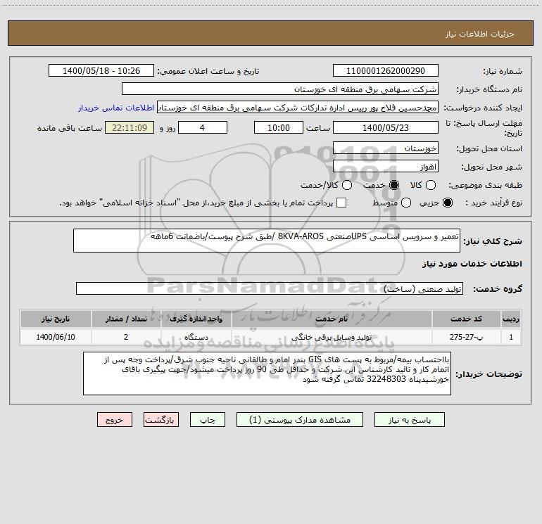 شرح کلی نیاز: تعمیر و سرویس اساسی UPSصنعتی 8KVA-AROS /طبق شرح پیوست/باضمانت 6ماهه