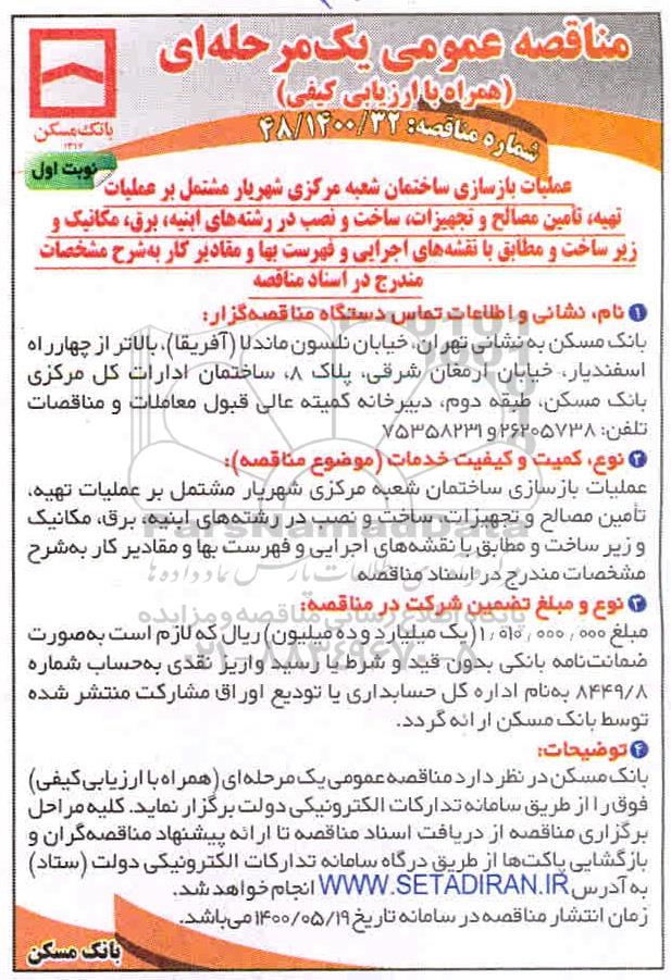 بانک مسکن در نظر دارد مناقصه عمومی یک مرحله ای همراه با ارزیابی کیفی فوق را از طریق سامانه تدارکات الکترونیکی دولت برگزار نماید. کلیه مراحل برگزاری مناقصه از دریافت اسناد مناقصه تا ارائه پیشنهاد مناقصه گران و بازگشایی پاکات از طریق درگاه سامانه دولت به نشانی ستاد ایران انجام خواهد شد