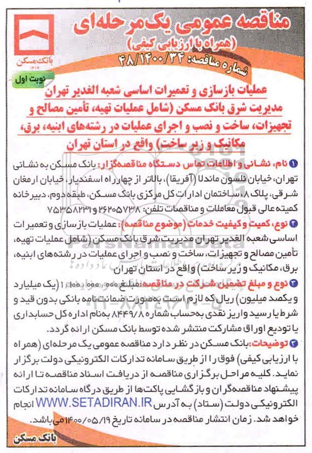 عملیات بازسازی و تعمیرات اساسی شعبه الغدیر تهران مدیریت شرق بانک مسکن(شامل عملیات تهیه، تامین مصالح و تجهیزات، ساخت و نصب و اجرای عملیات در رشته های ابنیه ، برق، مکانیک و زیرساخت) واقع در استان تهران