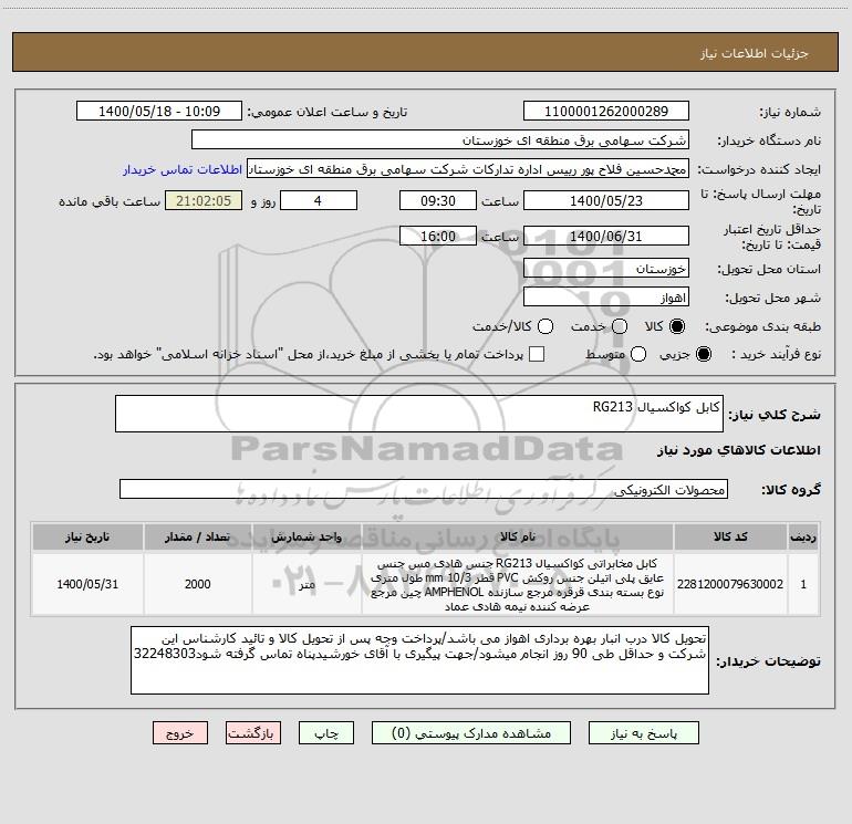 | 1 | 2281200079630002 | کابل مخابراتی کواکسیال RG213 جنس هادی مس جنس عایق پلی اتیلن جنس روکش PVC قطر 10/3 mm طول متری نوع بسته بندی قرقره مرجع سازنده AMPHENOL چین مرجع عرضه کننده نیمه هادی عماد | متر | 2000 | 1400/05/31 |