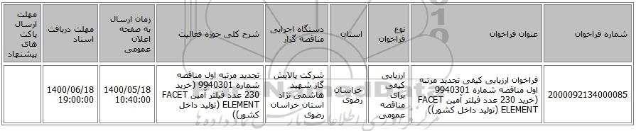 | 2000092134000085 | فراخوان ارزیابی کیفی تجدید مرتبه اول مناقصه شماره 9940301 (خرید 230 عدد فیلتر آمین FACET ELEMENT (تولید داخل کشور)) | ارزیابی کیفی برای مناقصه عمومی | خراسان رضوی | شرکت پالایش گاز شهید هاشمی نژاد استان خراسان رضوی | تجدید مرتبه اول مناقصه شماره 9940301 (خرید 230 عدد فیلتر آمین FACET ELEMENT (تولید داخل کشور)) | 1400/05/18 10:40:00 | 1400/06/18 19:00:00 |
