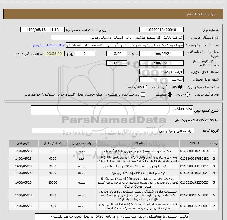 نام دستگاه خریدار:شرکت پالایش گاز شهید هاشمی نژاد استان خراسان رضوی
