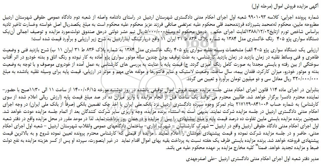 شماره پرونده اجرایی: کلاسه 9901093 شعبه اول اجرای احکام مدنی دادگستری شهرستان اردبیل در راستای دادنامه واصله از شعبه دوم دادگاه عمومی حقوقی شهرستان اردبیل مطروحه مابین، محکوم له:محمد بشیرزاده فرزندمحمد قلی محکوم علیه :مرتضی صادقی فرزند عزیز محکوم علیه محکوم است به مبلغ یکصدریال اصل خواسته وخسارت تاخیر تادیه براساس شاخص تورم ازتایخ1388/12/02لغایت اجرای حکم ، درحق محکوم له ومبلغ5/000/000ریال نیم عشر دولتی درحق صندوق دولت،مورد مزایده و توصیف اجمالی آن:یک دستگاه سواری پژو 405 رنگ خاکستری مدل 1384 به شماره پلاک 836 ط 31 ایران 11 واقع درپارکینگ ایثاراردبیل به شرح زیر ارزیابی و برآورد قیمت شده است؛