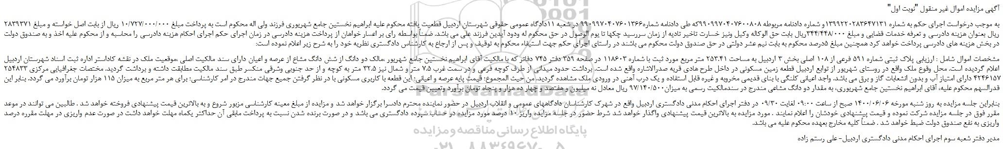 مشخصات اموال شامل : ارزیابی پلاک ثبتی شماره 591 فرعی از 108 اصلی بخش 3 اردبیل به مساحت 253.41 متر مربع مورد ثبت با شماره 118603 در صفحه 359 دفتر 745 دفاتر که با مالکیت آقای ابراهیم نخستین جامع شهریور ،مالک دو دانگ از شش دانگ مشاع از عرصه و اعیان دارای سند مالکیت اصلی ،موقعیت ملک در نقشه کاداستر اداره ثبت اسناد شهرستان اردبیل اعلام گردیده است. محل وقوع ملک واقع در روستای شهریور از توابع اردبیل قطعه زمین مسکونی در داخل طرح هادی قریه صدرالاشاره واقع شده است. برداشت حدود میدانی از طرف کوچه فرعی و در سمت غرب 7.5 متر و شمال نیز 32.5 متر به کوچه و از حد جنوبی وشرقی منکسر طبق سند مالکیت مطابقت داشته و برداشت گردید. مختصات جغرافیایی مرکزی 254833 4246157 دارای امتیاز آب و بدون انشعابات گاز و برق می باشد. واجد اعیانی کلنگی با بنای قدیمی مخروبه و غیره قابل استفاده و یک درب آهنی در ورودی ملک مشاهده گردید. من حیث المجموع؛ قیمت پایه عرصه و اعیانی؛ این قطعه با کاربری مسکونی با در نظر گرفتن جمیع جهات مندرج در امر کارشناسی؛ برای هر متر مربع به میزان 115 هزار تومان برآورد می گردد. بنابر این قدرالسهم محکوم علیه، آقای ابراهیم نخستین جامع شهریوری، به مقدار دو دانگ مشاعی مندرج در سندمالکیت رسمی به میزان97/140/500 ریال معادل نه میلیون و هفتصد و چهار ده هزار و پنجاه تومان برآورد وتعیین قیمت می گردد.
