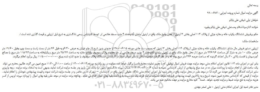 آگهی مزایده اموال شماره پرونده اجرایی : 9900682