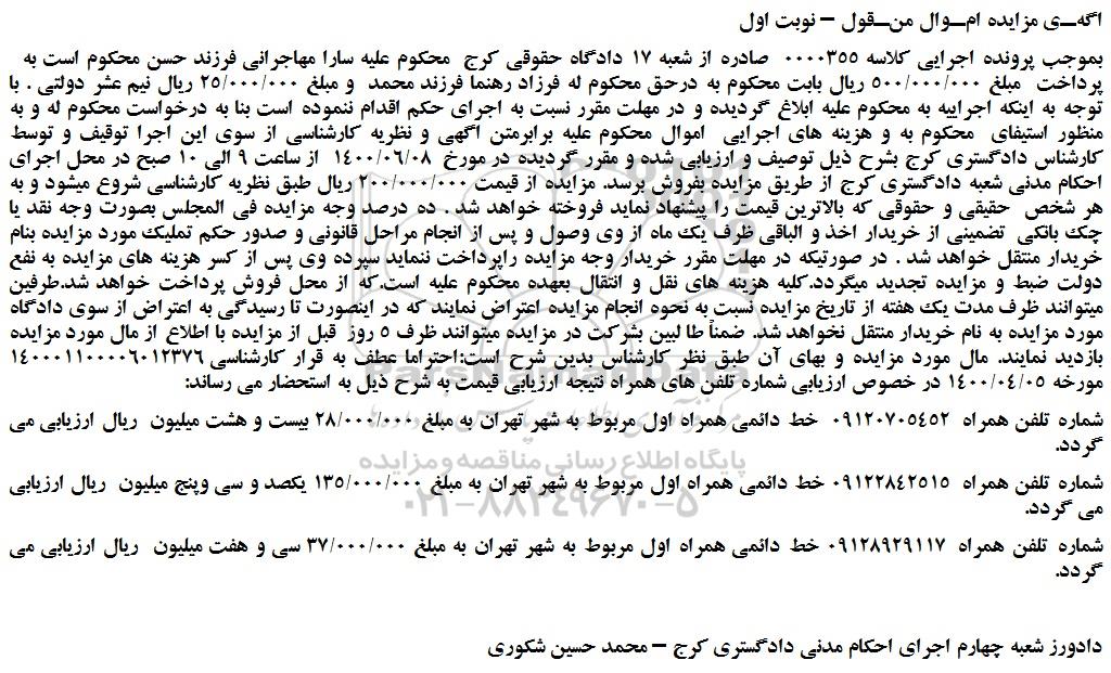 بموجب پرونده اجرایی کلاسه 0000355  صادره از شعبه 17 دادگاه حقوقی کرج  محکوم علیه سارا مهاجرانی فرزند حسن محکوم است به پرداخت  مبلغ 500/000/000 ریال بابت محکوم به درحق محکوم له فرزاد رهنما فرزند محمد  و مبلغ 25/000/000 ریال نیم عشر دولتی . با توجه به اینکه اجراییه به محکوم علیه ابلاغ گردیده و در مهلت مقرر نسبت به اجرای حکم اقدام ننموده است بنا به درخواست محکوم له و به منظور استیفای  محکوم به و هزینه های اجرایی  اموال محکوم علیه برابرمتن اگهی و نظریه کارشناسی از سوی این اجرا توقیف و توسط کارشناس دادگستری کرج بشرح ذیل توصیف و ارزیابی شده و مقرر گردیده در مورخ  1400/06/08  از ساعت 9 الی 10 صبح در محل اجرای احکام مدنی شعبه دادگستری کرج از طریق مزایده بفروش برسد. مزایده از قیمت 200/000/000 ریال طبق نظریه کارشناسی شروع میشود و به هر شخص  حقیقی و حقوقی که بالاترین قیمت را پیشنهاد نماید فروخته خواهد شد . ده درصد وجه مزایده فی المجلس بصورت وجه نقد یا چک بانکی  تضمینی از خریدار اخذ و الباقی ظرف یک ماه از وی وصول و پس از انجام مراحل قانونی و صدور حکم تملیک مورد مزایده بنام خریدار منتقل خواهد شد . در صورتیکه در مهلت مقرر خریدار وجه مزایده راپرداخت ننماید سپرده وی پس از کسر هزینه های مزایده به نفع دولت ضبط و مزایده تجدید میگردد.کلیه هزینه های نقل و انتقال بعهده محکوم علیه است.که از محل فروش پرداخت خواهد شد.طرفین میتوانند ظرف مدت یک هفته از تاریخ مزایده نسبت به نحوه انجام مزایده اعتراض نمایند که در اینصورت تا رسیدگی به اعتراض از سوی دادگاه مورد مزایده به نام خریدار منتقل نخواهد شد. ضمناً طا لبین بشرکت در مزایده میتوانند ظرف 5 روز  قبل از مزایده با اطلاع از مال مورد مزایده بازدید نمایند. مال مورد مزایده و بهای آن طبق نظر کارشناس بدین شرح است:احتراما عطف به قرار کارشناسی 140001100006012376 مورخه 1400/04/05 در خصوص ارزیابی شماره تلفن های همراه نتیجه ارزیابی قیمت به شرح ذیل به استحضار می رساند: