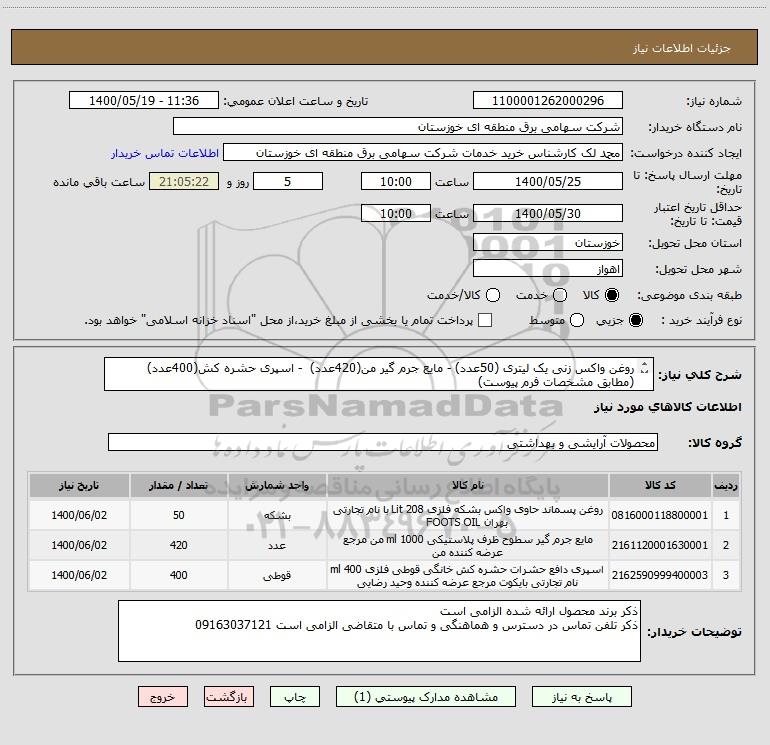 استعلام روغن واکس زنی یک لیتری (50عدد) - مایع جرم گیر من(420عدد) - اسپری حشره کش(400عدد) (مطابق مشخصات فرم پیوست) , استعلام روغن واکس زنی یک لیتری (50عدد) - مایع جرم گیر من(420عدد) - اسپری حشره کش(400عدد) (مطابق مشخصات فرم پیوست)