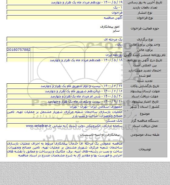 مناقصه عمومی یک مرحله ای خدمات پیمانکاری مربوط به اجرای عملیات بازسازی ساختمان شعبه مرکزی شهریار مشتمل بر عملیات تهیه، تامین مصالح وتجهیزات، ساخت و نصب در رشته¬های ابنیه، برق، مکانیک و زیرساخت و مطابق با نقشه های اجرایی و فهرست بها و مقادیر کار به شرح مشخصات مندرج در اسناد مناقصه