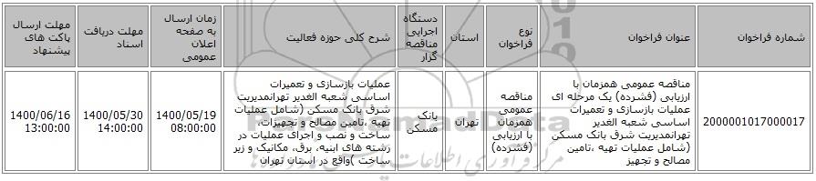 مناقصه، مناقصه عمومی همزمان با ارزیابی (فشرده) یک مرحله ای عملیات بازسازی و تعمیرات اساسی شعبه الغدیر تهرانمدیریت شرق بانک مسکن (شامل عملیات تهیه ،تامین مصالح و تجهیز از کلیه افراد متخصص و شرکتها واجد شرایط دعوت به عمل میآید در مناقصه با کد خبرگزاری پارس نماد: 3664740 شرکت نمایند.