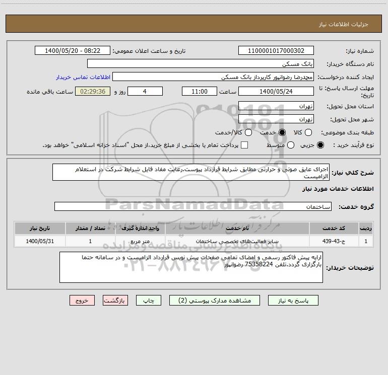 شرح کلی نیاز: اجرای عایق صوتی و حرارتی مطابق شرایط قرارداد پیوست.رعایت مفاد فایل شرایط شرکت در استعلام الزامیست
