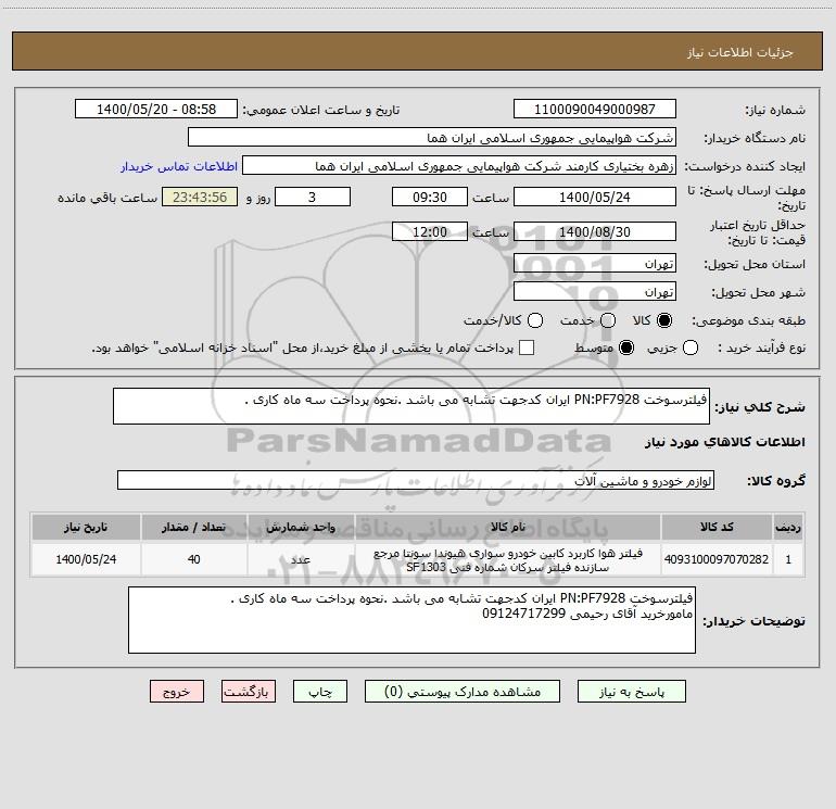 شرح کلی نیاز: فیلترسوخت PN:PF7928 ایران کدجهت تشابه می باشد .نحوه پرداخت سه ماه کاری .