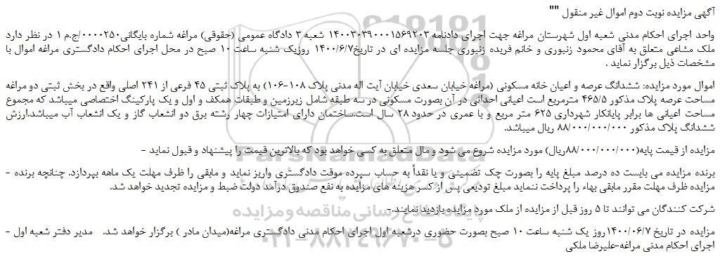 "آگهی مزایده نوبت دوم اموال غیر منقول "