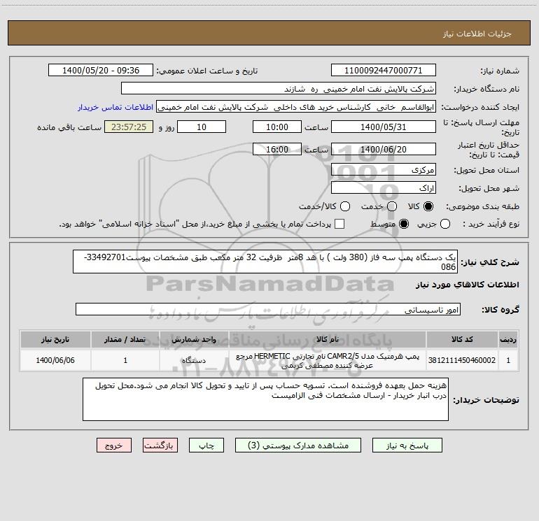 شرح کلی نیاز: یک دستگاه پمپ سه فاز (380 ولت ) با هد 8متر ظرفیت 32 متر مکعب طبق مشخصات پیوست33492701- 086