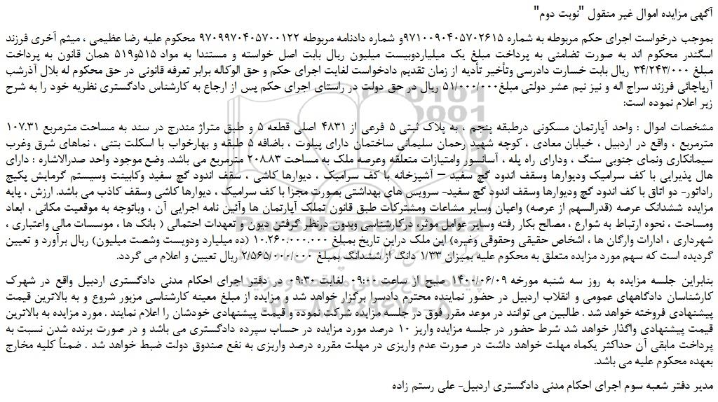 مشخصات اموال : واحد آپارتمان مسکونی درطبقه پنجم ، به پلاک ثبتی 5 فرعی از 4831 اصلی قطعه 5 و طبق متراژ مندرج در سند به مساحت مترمربع 107.31 مترمربع ، واقع در اردبیل ، خیابان معادی ، کوچه شهید رحمان سلیمانی ساختمان دارای پیلوت ، باضافه 5 طبقه و بهارخواب با اسکلت بتنی ، نماهای شرق وغرب سیمانکاری ونمای جنوبی سنگ ، ودارای راه پله ، آسانسور وامتیازات متعلقه وعرصه ملک به مساحت 208.83 مترمربع می باشد. وضع موجود واحد صدرالاشاره : دارای هال پذیرایی با کف سرامیک ودیوارها وسقف اندود گچ سفید – آشپزخانه با کف سرامیک ، دیوارها کاشی ، سقف اندود گچ سفید وکابینت وسیستم گرمایش پکیج راداتور- دو اتاق با کف اندود گچ ودیوارها وسقف اندود گچ سفید- سرویس های بهداشتی بصورت مجزا با کف سرامیک ، دیوارها کاشی وسقف کاذب می باشد. ارزش ، پایه مزایده ششدانک عرصه (قدرالسهم از عرصه) واعیان وسایر مشاعات ومشترکات طبق قانون تملک آپارتمان ها وآئین نامه اجرایی آن ، وباتوجه به موقعیت مکانی ، ابعاد ومساحت ، نحوه ارتباط به شوارع ، مصالح بکار رفته وسایر عوامل موثر، درکارشناسی وبدون درنظر گرفتن دیون و تعهدات احتمالی ( بانک ها ، موسسات مالی واعتباری ، شهرداری ، ادارات وارگان ها ، اشخاص حقیقی وحقوقی وغیره) این ملک دراین تاریخ بمبلغ 10.260.000.000 (ده میلیارد ودویست وشصت میلیون) ریال برآورد و تعیین گردیده است که سهم مورد مزایده متعلق به محکوم علیه بمیزان 1/33 دانگ از ششدانگ بمبلغ 2/565/000/000 ریال تعیین و اعلام می گردد.