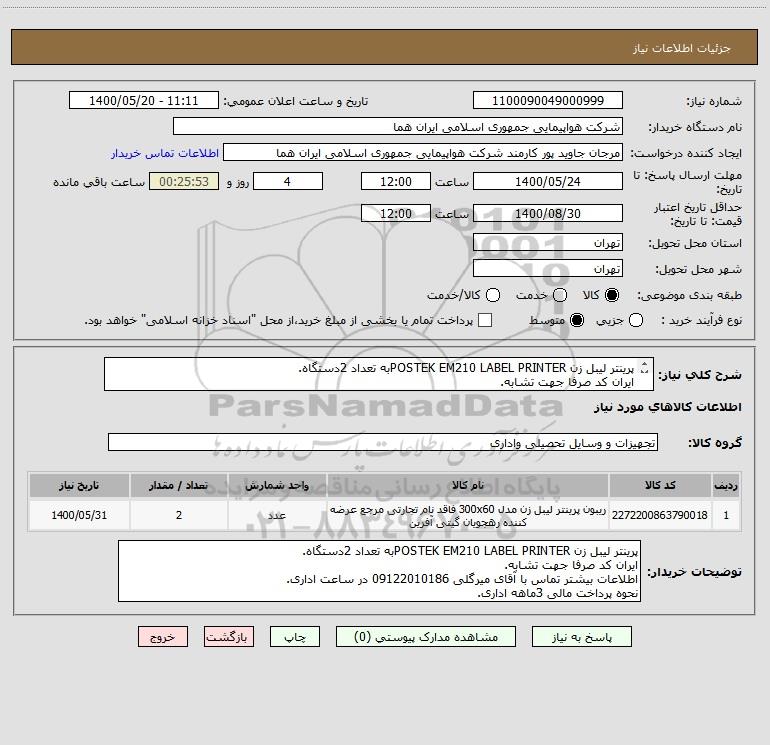توضیحات خریدار:پرینتر لیبل زن POSTEK EM210 LABEL PRINTERبه تعداد 2دستگاه. ایران کد صرفا جهت تشابه. اطلاعات بیشتر تماس با آقای میرگلی 09122010186 در ساعت اداری. نحوه پرداخت مالی 3ماهه اداری.