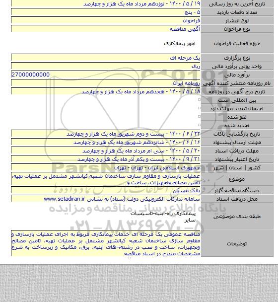 مناقصه عمومی یک مرحله ای خدمات پیمانکاری مربوط به اجرای عملیات بازسازی و مقاوم سازی ساختمان شعبه کیانشهر مشتمل بر عملیات تهیه، تامین مصالح وتجهیزات، ساخت و نصب در رشته¬های ابنیه، برق، مکانیک و زیرساخت به شرح مشخصات مندرج در اسناد مناقصه