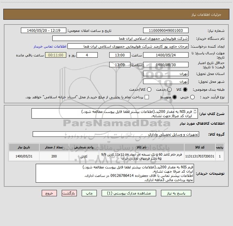 شرح کلی نیاز: فرم NIS به مقدار 200پد.(اطلاعات بیشتر لطفا فایل پیوست مطالعه شود.) ایران کد صرفا جهت تشابه. اطلاعات بیشتر توضیحات مطالعه شود.