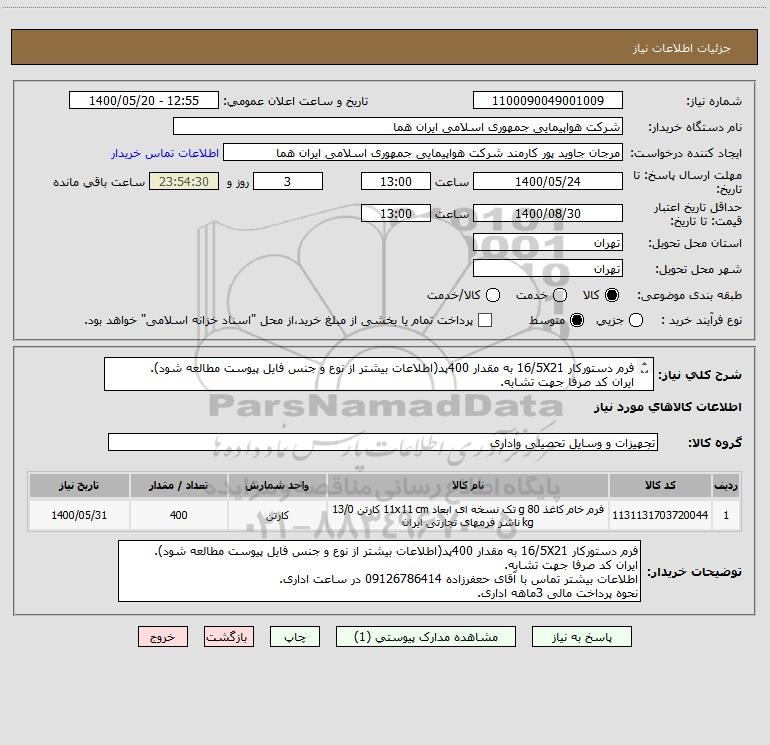 شرح کلی نیاز: فرم دستورکار 16/5X21 به مقدار 400پد(اطلاعات بیشتر از نوع و جنس فایل پیوست مطالعه شود).
