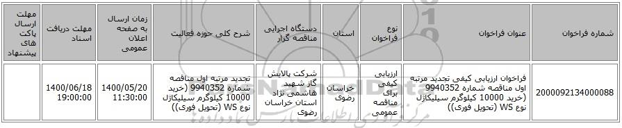 | 2000092134000088 | فراخوان ارزیابی کیفی تجدید مرتبه اول مناقصه شماره 9940352 (خرید 10000 کیلوگرم سیلیکاژل نوع WS (تحویل فوری)) | ارزیابی کیفی برای مناقصه عمومی | خراسان رضوی | شرکت پالایش گاز شهید هاشمی نژاد استان خراسان رضوی | تجدید مرتبه اول مناقصه شماره 9940352 (خرید 10000 کیلوگرم سیلیکاژل نوع WS (تحویل فوری)) | 1400/05/20 11:30:00 | 1400/06/18 19:00:00 |