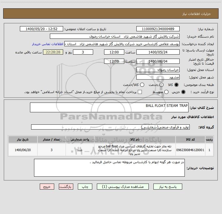 نام دستگاه خریدار:شرکت پالایش گاز شهید هاشمی نژاد استان خراسان رضوی