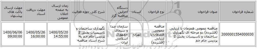 | 2000001554000030 | مناقصه عمومی همزمان با ارزیابی (فشرده) دو مرحله ای نگهداری ساختمان و تاسیسات بخش 2 پردیس جام جم | مناقصه عمومی همزمان با ارزیابی (فشرده) | تهران | سازمان صدا و سیمای جمهوری اسلامی ایران | نگهداری ساختمان و تاسیسات بخش 2 پردیس جام جم به شرح اسناد مناقصه | 1400/05/20 14:55:00 | 1400/05/26 16:00:00 | 1400/06/06 09:00:00 |