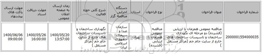 مناقصه، مناقصه عمومی همزمان با ارزیابی (فشرده) دو مرحله ای نگهداری ساختمان و تاسیسات ساختمان های خارج از سایت جام جم (مراکز مستقل ), مناقصه عمومی همزمان با ارزیابی (فشرده) دو مرحله ای نگهداری ساختمان و تاسیسات ساختمان های خارج از سایت جام جم (مراکز مستقل )