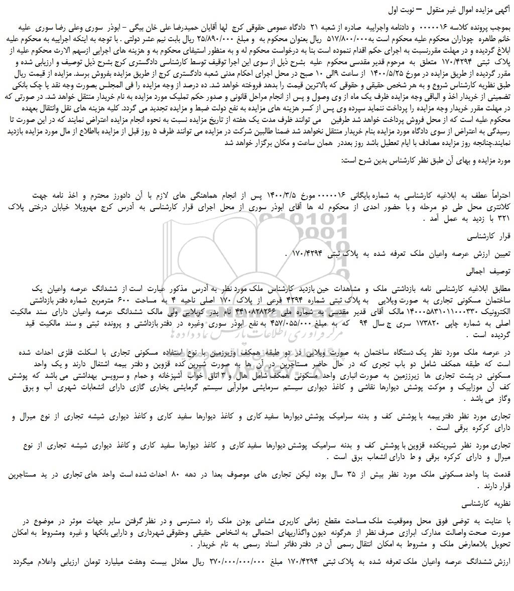 بموجب پرونده کلاسه 0000016 و دادنامه واجراییه صادره از شعبه 21 دادگاه عمومی حقوقی کرج لها آقایان حمیدرضا علی خان بیگی - ابوذر سوری وعلی رضا سوری علیه خانم طاهره چوداران محکوم علیه محکوم است به517/800/000 ریال بعنوان محکوم به و مبلغ 25/890/000 ریال بابت نیم عشر دولتی . با توجه به اینکه اجراییه به محکوم علیه ابلاغ گردیده و در مهلت مقررنسبت به اجرای حکم اقدام ننموده است بنا به درخواست محکوم له و به منظور استیفای محکوم به و هزینه های اجرایی ازسهم الارث محکوم علیه از پلاک ثبتی 170/4294 متعلق به مرحوم قدیر مقدسی محکوم علیه بشرح ذیل از سوی این اجرا توقیف توسط کارشناسی دادگستری کرج بشرح ذیل توصیف و ارزیابی شده و مقرر گردیده از طریق مزایده در مورخ 1400/5/25 از ساعت 9الی 10 صبح در محل اجرای احکام مدنی شعبه دادگستری کرج از طریق مزایده بفروش برسد. مزایده از قیمت ریال طبق نظریه کارشناس شروع و به هر شخص حقیقی و حقوقی که بالاترین قیمت را بدهد فروخته خواهد شد. ده درصد از وجه مزایده را فی المجلس بصورت وجه نقد یا چک بانکی تضمینی از خریدار اخذ و الباقی وجه مزایده ظرف یک ماه از وی وصول و پس از انجام مراحل قانونی و صدور حکم تملیک مورد مزایده به نام خریدار منتقل خواهد شد. در صورتی که در مهلت مقرر خریدار وجه مزایده را پرداخت ننماید سپرده وی پس از کسر هزینه های مزایده به نفع دولت ضبط و مزایده تجدید می گردد. کلیه هزینه های نقل وانتقال بعهده محکوم علیه است که از محل فروش پرداخت خواهد شد طرفین می توانند ظرف مدت یک هفته از تاریخ مزایده نسبت به نحوه انجام مزایده اعتراض نمایند که در این صورت تا رسیدگی به اعتراض از سوی دادگاه مورد مزایده بنام خریدار منتقل نخواهد شد ضمنا طالبین شرکت در مزایده می توانند ظرف 5 روز قبل از مزایده بااطلاع از مال مورد مزایده بازدید نمایند.چنانجه روز مزایده مصادف با ایام تعطیل باشد روز بعددر همان ساعت و مکان برگزار خواهد شد