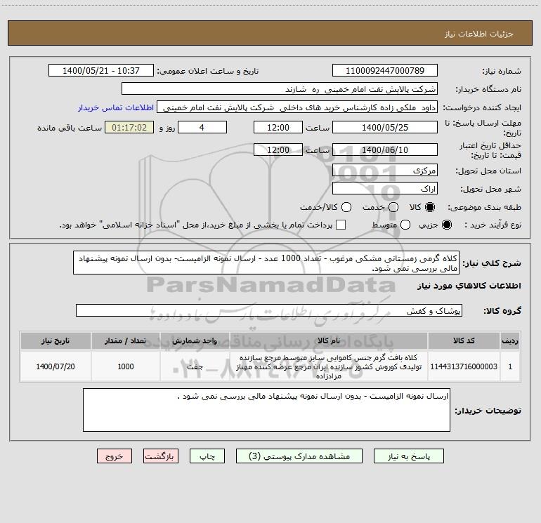 شرح کلی نیاز: کلاه گرمی زمستانی مشکی مرغوب - تعداد 1000 عدد - ارسال نمونه الزامیست- بدون ارسال نمونه پیشنهاد مالی بررسی نمی شود.