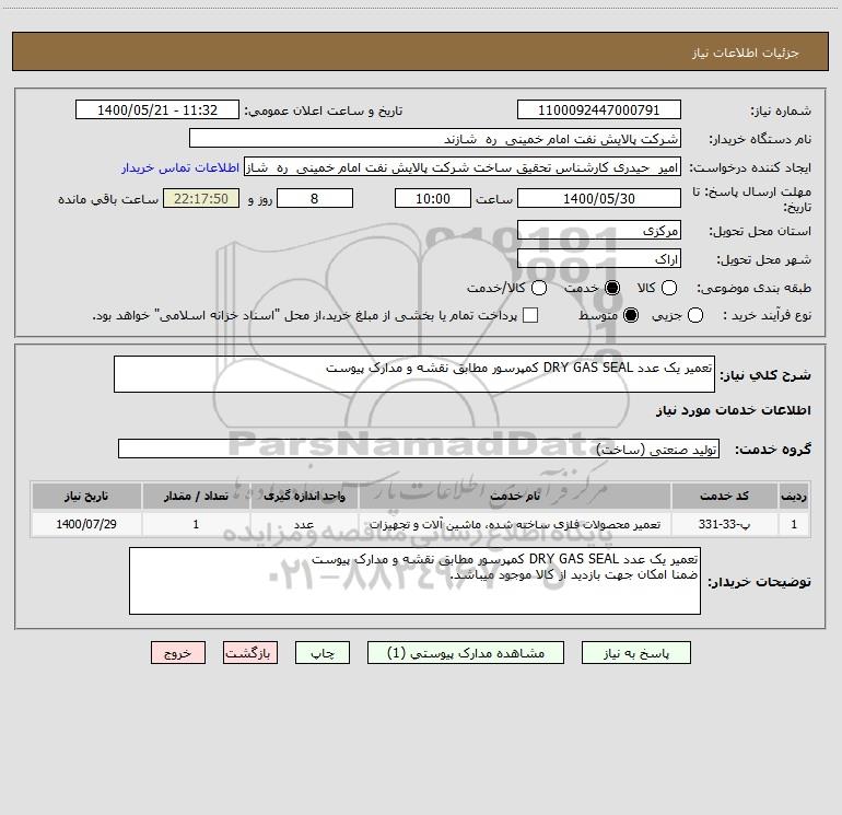 شرح کلی نیاز: تعمیر یک عدد DRY GAS SEAL کمپرسور مطابق نقشه و مدارک پیوست