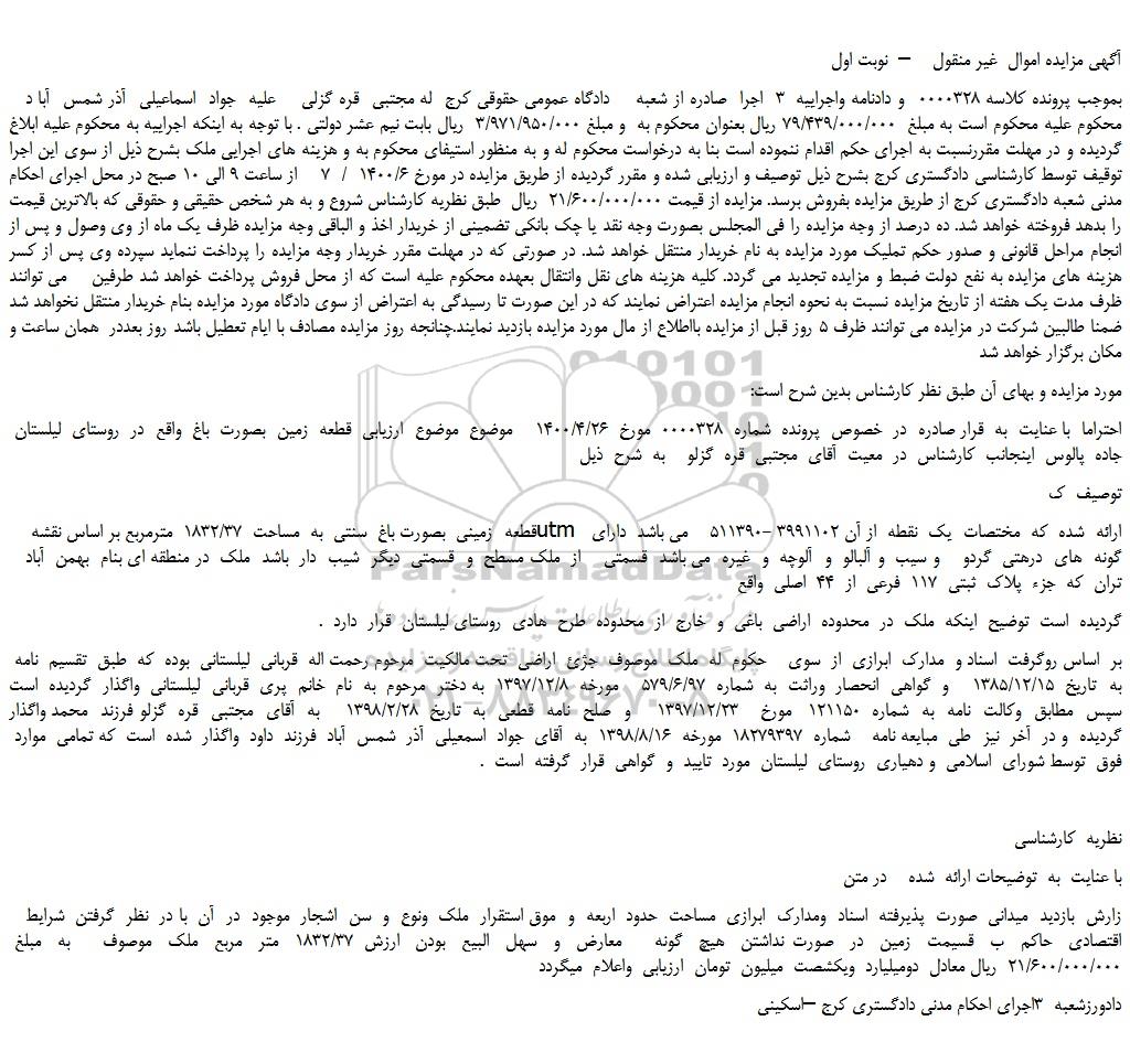 بموجب پرونده کلاسه 0000328 و دادنامه واجراییه 3 اجرا صادره از شعبه دادگاه عمومی حقوقی کرج له مجتبی قره گزلی علیه جواد اسماعیلی آذر شمس آبا د محکوم علیه محکوم است به مبلغ 79/439/000/000 ریال بعنوان محکوم به و مبلغ 3/971/950/000 ریال بابت نیم عشر دولتی . با توجه به اینکه اجراییه به محکوم علیه ابلاغ گردیده و در مهلت مقررنسبت به اجرای حکم اقدام ننموده است بنا به درخواست محکوم له و به منظور استیفای محکوم به و هزینه های اجرایی ملک بشرح ذیل از سوی این اجرا توقیف توسط کارشناسی دادگستری کرج بشرح ذیل توصیف و ارزیابی شده و مقرر گردیده از طریق مزایده در مورخ 1400/6 / 7 از ساعت 9 الی 10 صبح در محل اجرای احکام مدنی شعبه دادگستری کرج از طریق مزایده بفروش برسد. مزایده از قیمت 21/600/000/000 ریال طبق نظریه کارشناس شروع و به هر شخص حقیقی و حقوقی که بالاترین قیمت را بدهد فروخته خواهد شد. ده درصد از وجه مزایده را فی المجلس بصورت وجه نقد یا چک بانکی تضمینی از خریدار اخذ و الباقی وجه مزایده ظرف یک ماه از وی وصول و پس از انجام مراحل قانونی و صدور حکم تملیک مورد مزایده به نام خریدار منتقل خواهد شد. در صورتی که در مهلت مقرر خریدار وجه مزایده را پرداخت ننماید سپرده وی پس از کسر هزینه های مزایده به نفع دولت ضبط و مزایده تجدید می گردد. کلیه هزینه های نقل وانتقال بعهده محکوم علیه است که از محل فروش پرداخت خواهد شد طرفین می توانند ظرف مدت یک هفته از تاریخ مزایده نسبت به نحوه انجام مزایده اعتراض نمایند که در این صورت تا رسیدگی به اعتراض از سوی دادگاه مورد مزایده بنام خریدار منتقل نخواهد شد ضمنا طالبین شرکت در مزایده می توانند ظرف 5 روز قبل از مزایده بااطلاع از مال مورد مزایده بازدید نمایند.چنانجه روز مزایده مصادف با ایام تعطیل باشد روز بعددر همان ساعت و مکان برگزار خواهد شد