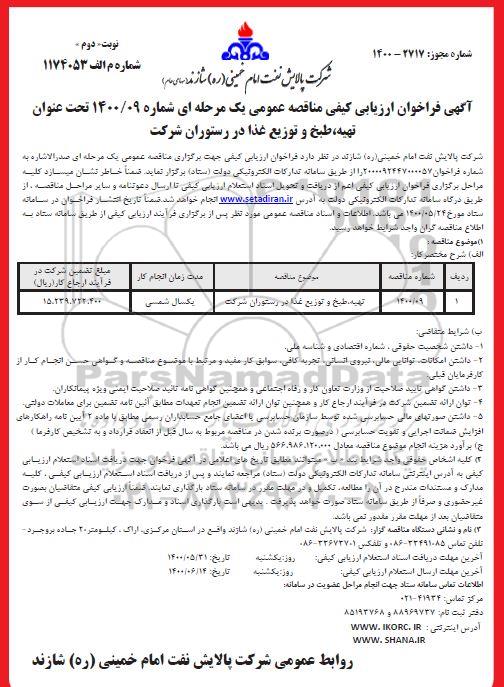 | 1400/09 | تهیه، طبخ و توزیع غذا در رستوران شرکت | یکسال شمسی |
