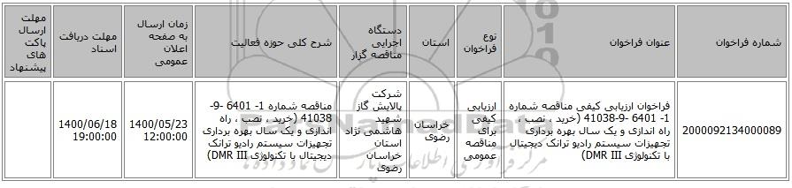 مناقصه، فراخوان ارزیابی کیفی مناقصه شماره 1- 6401 -9-41038 (خرید ، نصب ، راه اندازی و یک سال بهره برداری تجهیزات سیستم رادیو ترانک دیجیتال با تکنولوژی DMR III), فراخوان ارزیابی کیفی مناقصه شماره 1- 6401 -9-41038 (خرید ، نصب ، راه اندازی و یک سال بهره برداری تجهیزات سیستم رادیو ترانک دیجیتال با تکنولوژی DMR III)