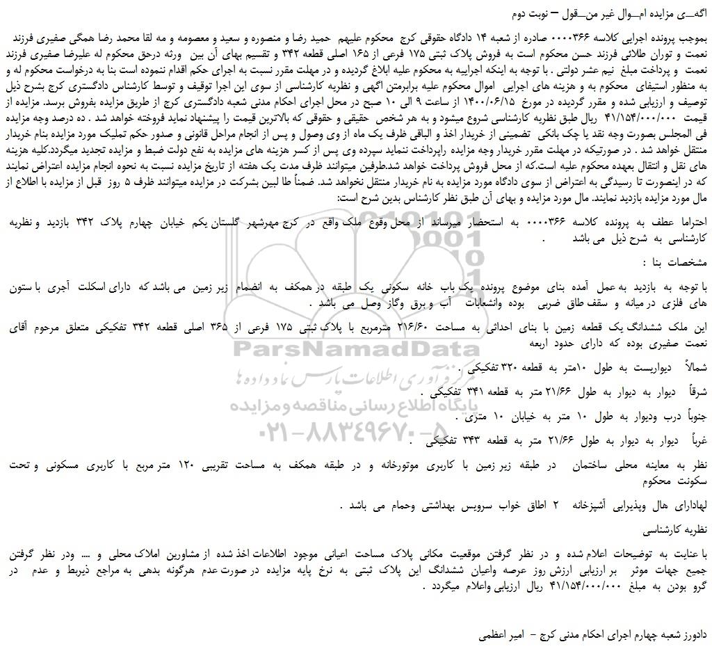 بموجب پرونده اجرایی کلاسه 0000366 صادره از شعبه 14 دادگاه حقوقی کرج  محکوم علیهم  حمید رضا و منصوره و سعید و معصومه و مه لقا محمد رضا همگی صفیری فرزند نعمت و توران طلائی فرزند حسن محکوم است به فروش پلاک ثبتی 175 فرعی از 165 اصلی قطعه 342 و تقسیم بهای آن بین  ورثه درحق محکوم له علیرضا صفیری فرزند نعمت  و پرداخت مبلغ  نیم عشر دولتی . با توجه به اینکه اجراییه به محکوم علیه ابلاغ گردیده و در مهلت مقرر نسبت به اجرای حکم اقدام ننموده است بنا به درخواست محکوم له و به منظور استیفای  محکوم به و هزینه های اجرایی  اموال محکوم علیه برابرمتن اگهی و نظریه کارشناسی از سوی این اجرا توقیف و توسط کارشناس دادگستری کرج بشرح ذیل توصیف و ارزیابی شده و مقرر گردیده در مورخ  1400/06/15 از ساعت 9 الی 10 صبح در محل اجرای احکام مدنی شعبه دادگستری کرج از طریق مزایده بفروش برسد. مزایده از قیمت  41/154/000/000  ریال طبق نظریه کارشناسی شروع میشود و به هر شخص  حقیقی و حقوقی که بالاترین قیمت را پیشنهاد نماید فروخته خواهد شد . ده درصد وجه مزایده فی المجلس بصورت وجه نقد یا چک بانکی  تضمینی از خریدار اخذ و الباقی ظرف یک ماه از وی وصول و پس از انجام مراحل قانونی و صدور حکم تملیک مورد مزایده بنام خریدار منتقل خواهد شد . در صورتیکه در مهلت مقرر خریدار وجه مزایده راپرداخت ننماید سپرده وی پس از کسر هزینه های مزایده به نفع دولت ضبط و مزایده تجدید میگردد.کلیه هزینه های نقل و انتقال بعهده محکوم علیه است.که از محل فروش پرداخت خواهد شد.طرفین میتوانند ظرف مدت یک هفته از تاریخ مزایده نسبت به نحوه انجام مزایده اعتراض نمایند که در اینصورت تا رسیدگی به اعتراض از سوی دادگاه مورد مزایده به نام خریدار منتقل نخواهد شد. ضمناً طا لبین بشرکت در مزایده میتوانند ظرف 5 روز  قبل از مزایده با اطلاع از مال مورد مزایده بازدید نمایند. مال مورد مزایده و بهای آن طبق نظر کارشناس بدین شرح است: