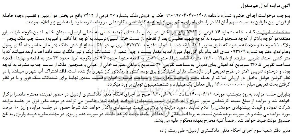 بموجب درخواست اجرای حکم و شماره دادنامه 9909970404701408 حکم بر فروش ملک بشماره 36 فرعی از 7412 واقع در بخش دو اردبیل و تقسیم وجوه حاصله از فروش بین طرفین به نسبت سهم آنان لذا در راستای اجرای حکم پس از ارجاع به کارشناسی ، کارشناس مربوطه نظریه خود را به شرح زیر اعلام نمودند: