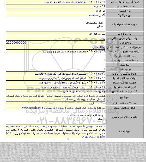 مناقصه عمومی یک مرحله ای عملیات بازسازی و تعمیرات اساسی شعبه الغدیر –تهران مدیریت شرق بانک مسکن (شامل عملیات تهیه، تامین مصالح و تجهیزات، حمل، ساخت و نصب و اجرای عملیات در رشته های ابنیه، برق، مکانیک و زیرساخت) واقع در استان تهران